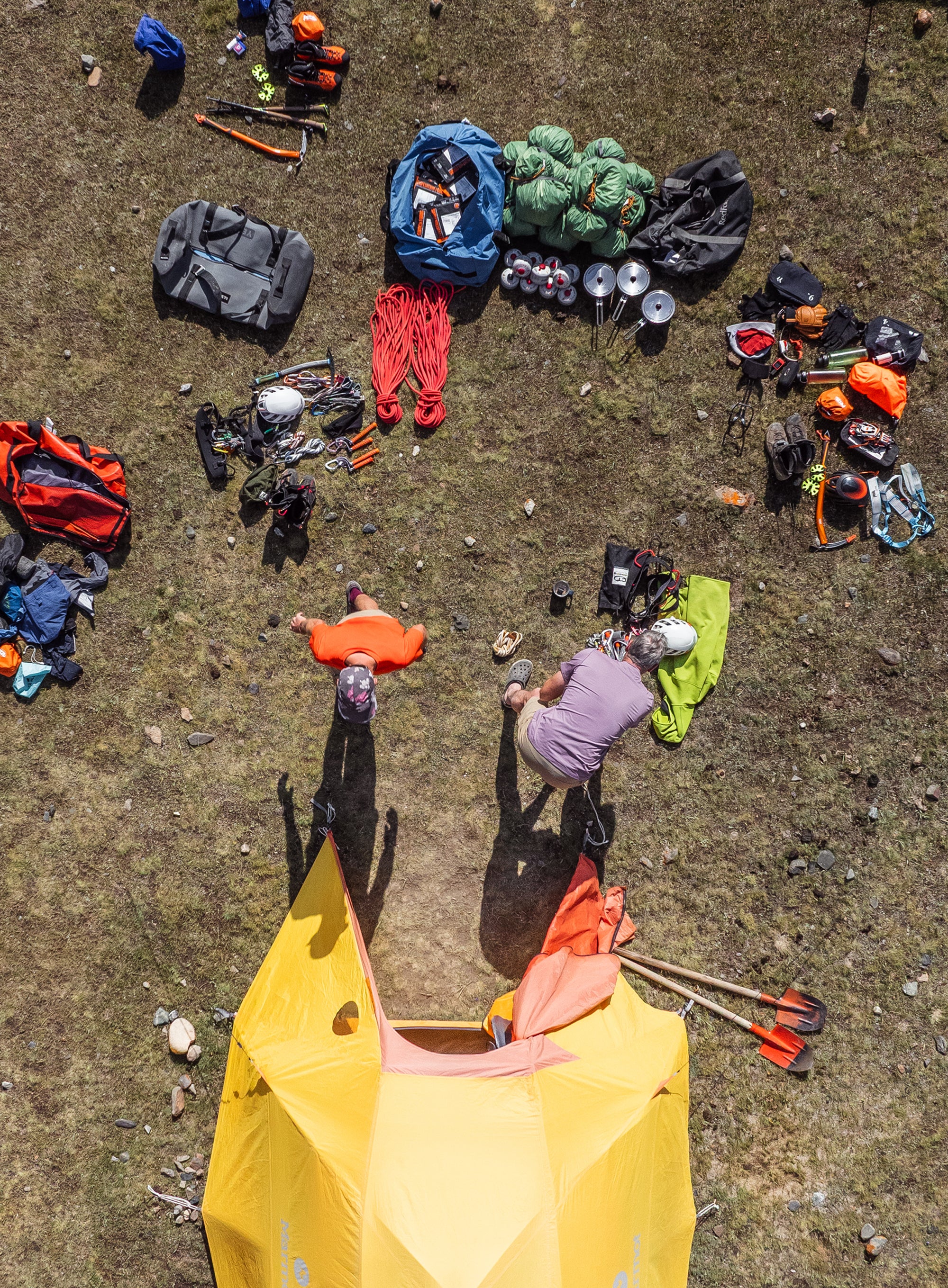 We did not linger. Clouds built, the snow softened, and we retraced the ridge, jumping the same crevasse on a tight rope before working back across the glacier. We stopped at Camp 1 to collect our cache and carried on to ABC. By the time the tents came into view it was raining. I dropped my pack, half crawled into my bag with boots still on, and let the day finally catch up with me.