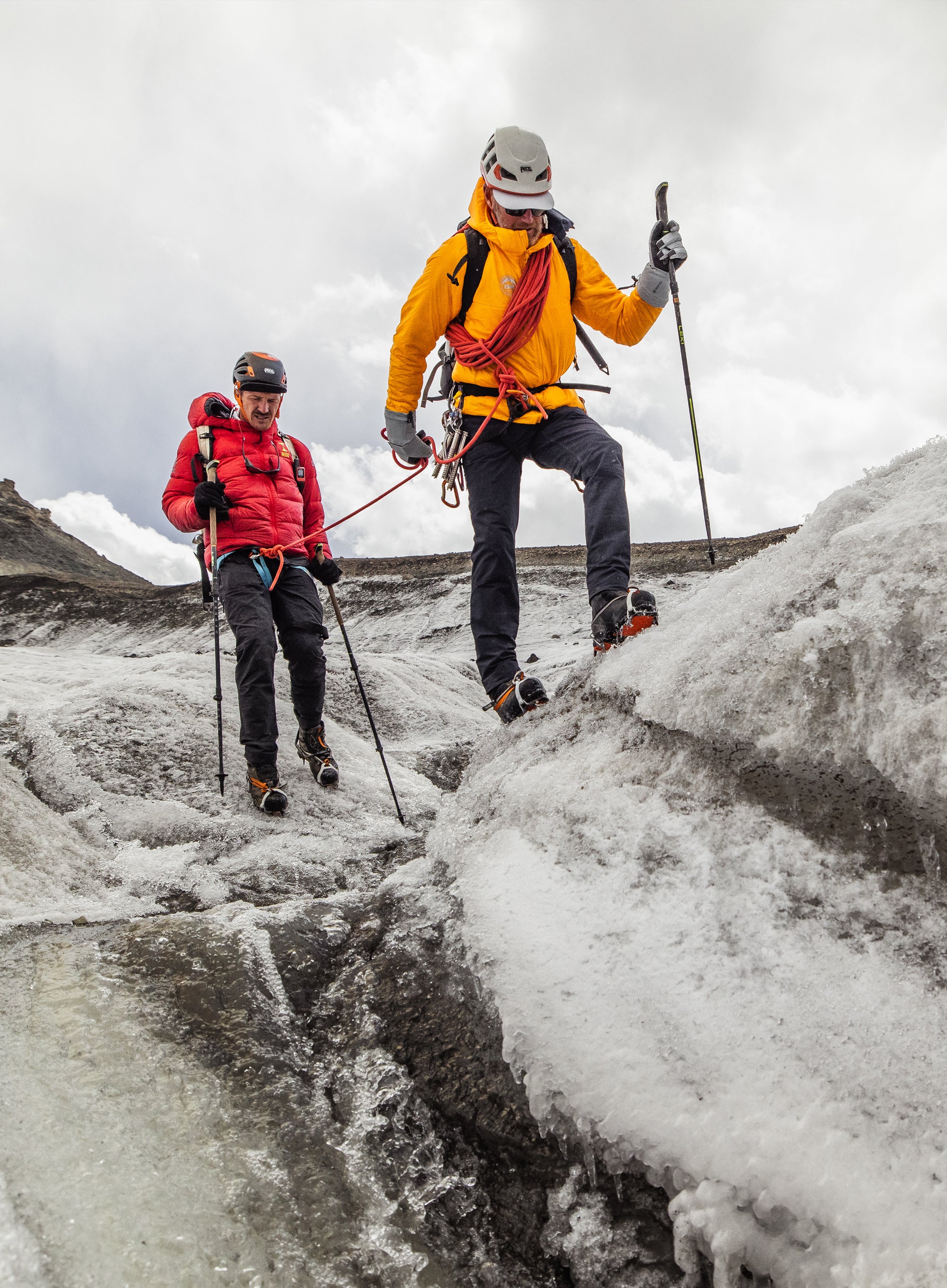 Alarms went at 04:30. We ate by headlamp, checked boots, crampons, ropes and cameras, then stepped onto the glacier. The ice was hard and glassy, each crampon bite felt like striking flint. Crevasses opened on both sides, some obvious, others skinned over by thin bridges.