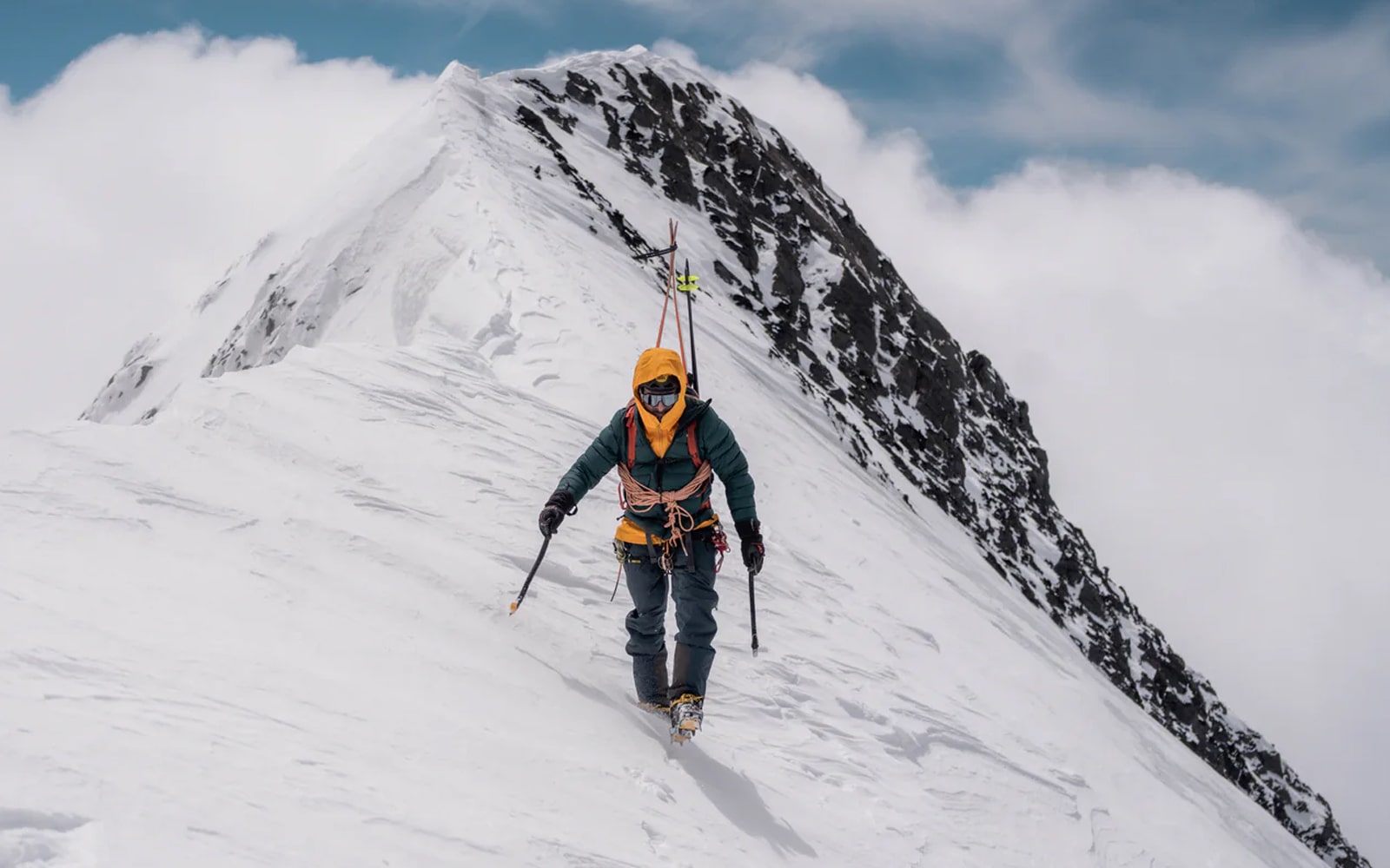 The angle steepened into firm snow and old ice. We front pointed in rhythm, kick kick, plant, step. A small bergschrund got an ice screw and tight belay, and we gave the wind-sculpted cornices a wide berth. The air thinned and the moves lengthened. Ed managed it with deliberate cadence, pole, step, breathe, placing each foot carefully and keeping his head. Not fast, but solid.