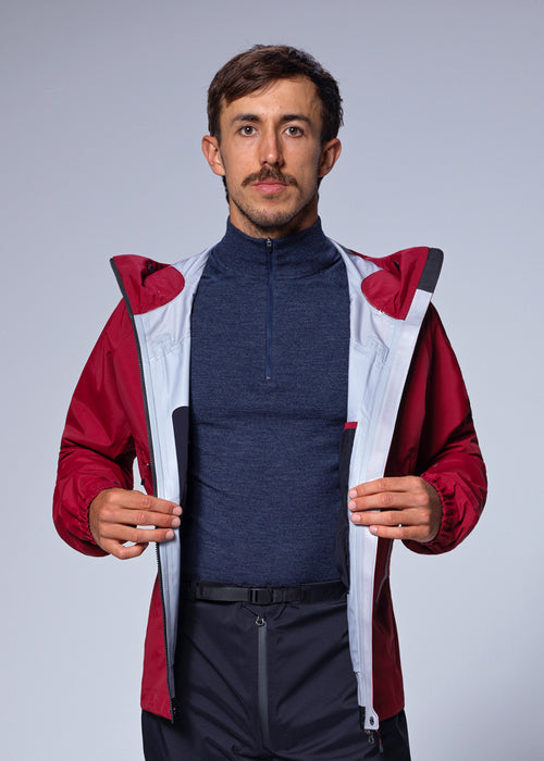 Its rich feature set includes integrated RECCO® Rescue System diode and antenna-based passive transponder, AquaGuard® zips with glove-friendly pullers, two-way main zip with stud closure, pit zips for venting, and a refined helmet-compatible storm hood with laminated mouldable peak. Inside, a zipped pocket keeps phone and valuables secure and an oversized mesh dump pocket will swallow hat, gloves or ski skins. Outside, large hand and chest pockets stay accessible under a pack or harness, with a forearm lift pass pocket for extra ease. Finishing details include anti-snag Cohaesive™ hem and hood adjusters, triple-stitched Hypalon® cuff tabs, and a soft micro-suede neck and beard guard for comfort.