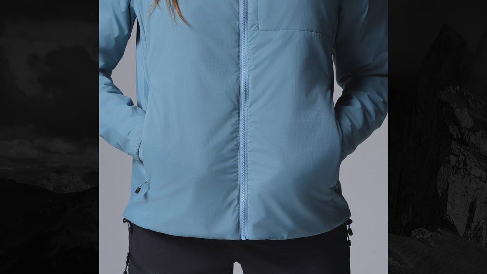 For reliable warmth even when wet, we body-mapped synthetic Thermolite® insulation and wrapped it in a mechanical stretch, windproof, rip-stop outer, complete with a DWR finish. A powerful and dynamic mix beneath a clean, minimalist aesthetic.