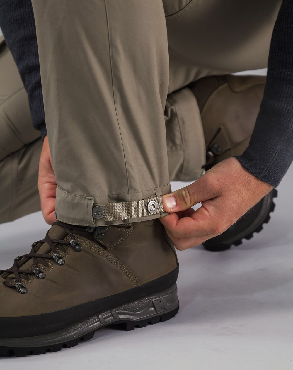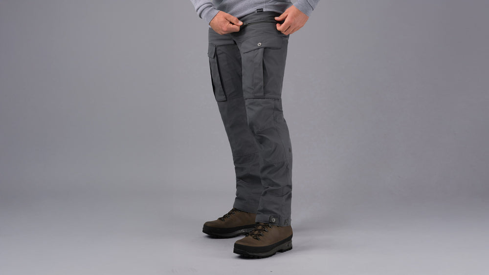 Pre-shaped knees and articulated patterning improve mobility over rock, bog, and broken ridge. Press-stud ankle adjusters seal in warmth and block the ingress of dirt, moisture and snow, while internal boot hooks lock securely to footwear. Cleverly engineered low-profile elastic and Velcro waist cinches haul in tight with a quick pull, giving on-the-fly adjustment in a matter of seconds, for a secure, stretch-comfort fit under load. Additional elastic strap adjusters at the leg hems allow instant adaptation to terrain, footwear, and movement. Seven secure and hard-wearing pockets - including dual map-sized thigh pockets - provide versatile storage on long adventures.