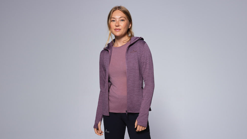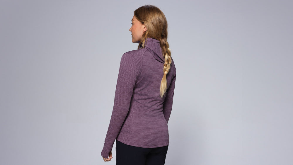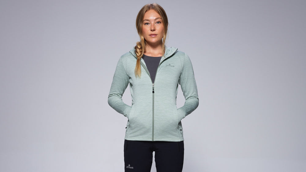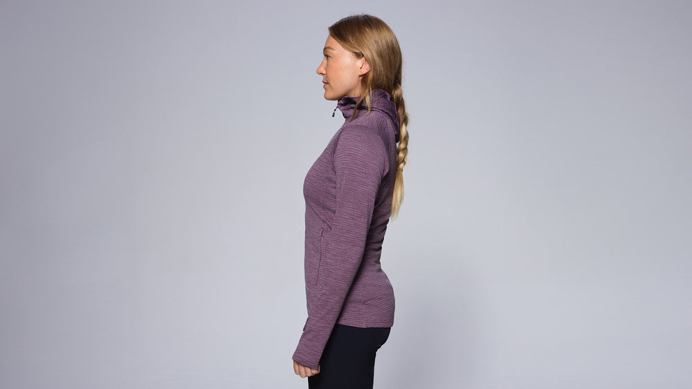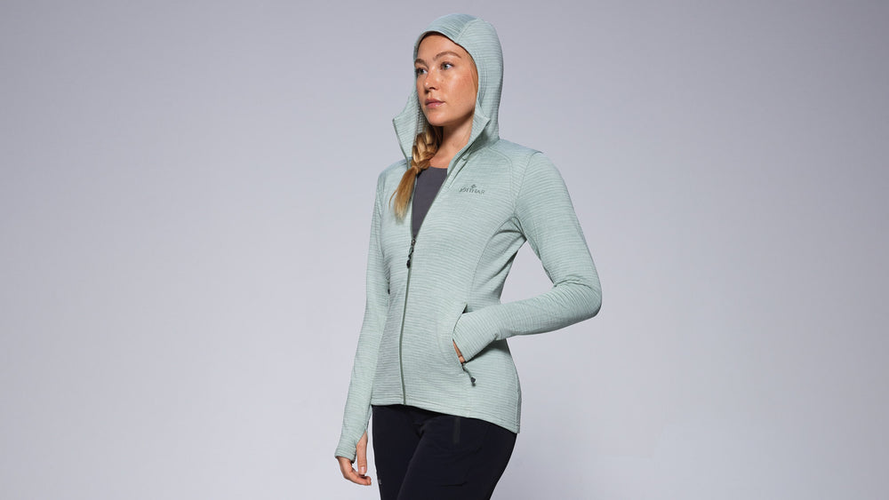 As the temperature drops, pull up the close-fitting hood and slip into the thumb loops.