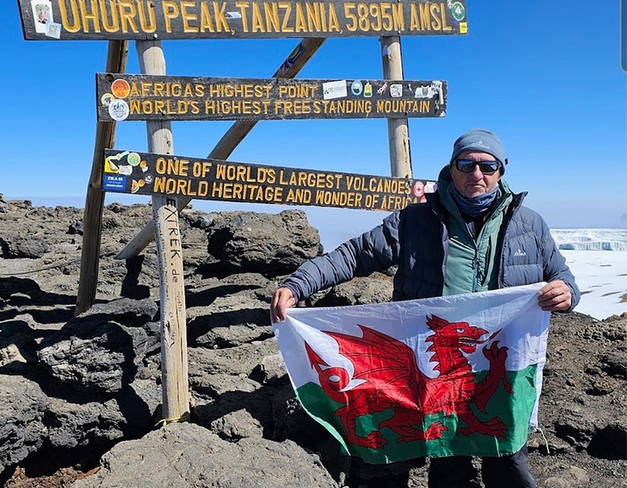 Gareth flies the Welsh flag on Mount Kilimanjaro, Tanzania.